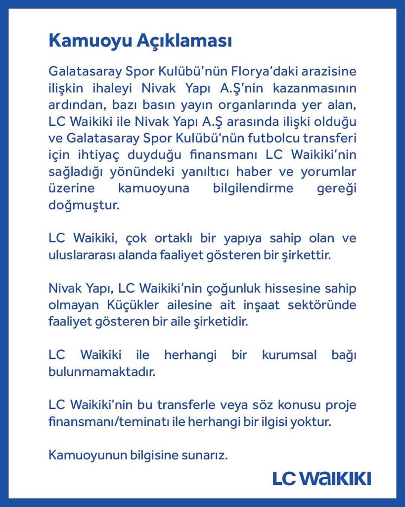 Galatasaray Spor Kulübü’nün Florya’daki arazisine ilişkin ihaleyi Nivak Yapı A.Ş’nin kazanmasının ardından, bazı basın yayın organlarında yer alan, LC Waikiki ile Nivak Yapı A.Ş. arasında ilişki olduğu ve Galatasaray Spor Kulübü’nün futbolcu transferi için ihtiyaç duyduğu finansmanı LC Waikiki’nin sağladığı yönündeki yanıltıcı haber ve yorumlar üzerine kamuoyuna bilgilendirme gereği doğmuştur.